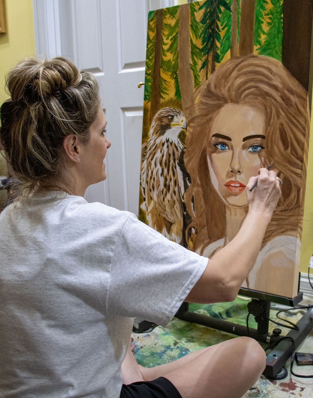 With a big family, several pets, and companies to manage, I find it essential to plan projects properly so as to have enough time when I escape to my studio: "Art World." I start a piece by choosing my subjects (the pairing of animal and woman), then plan it out on the canvas wither either markmaking or drawing. From there, I use a mix of natural and synthetic brushes to apply acrylic and oil paints, usually layering the oils on top of the acrylics for a more vibrant finish.